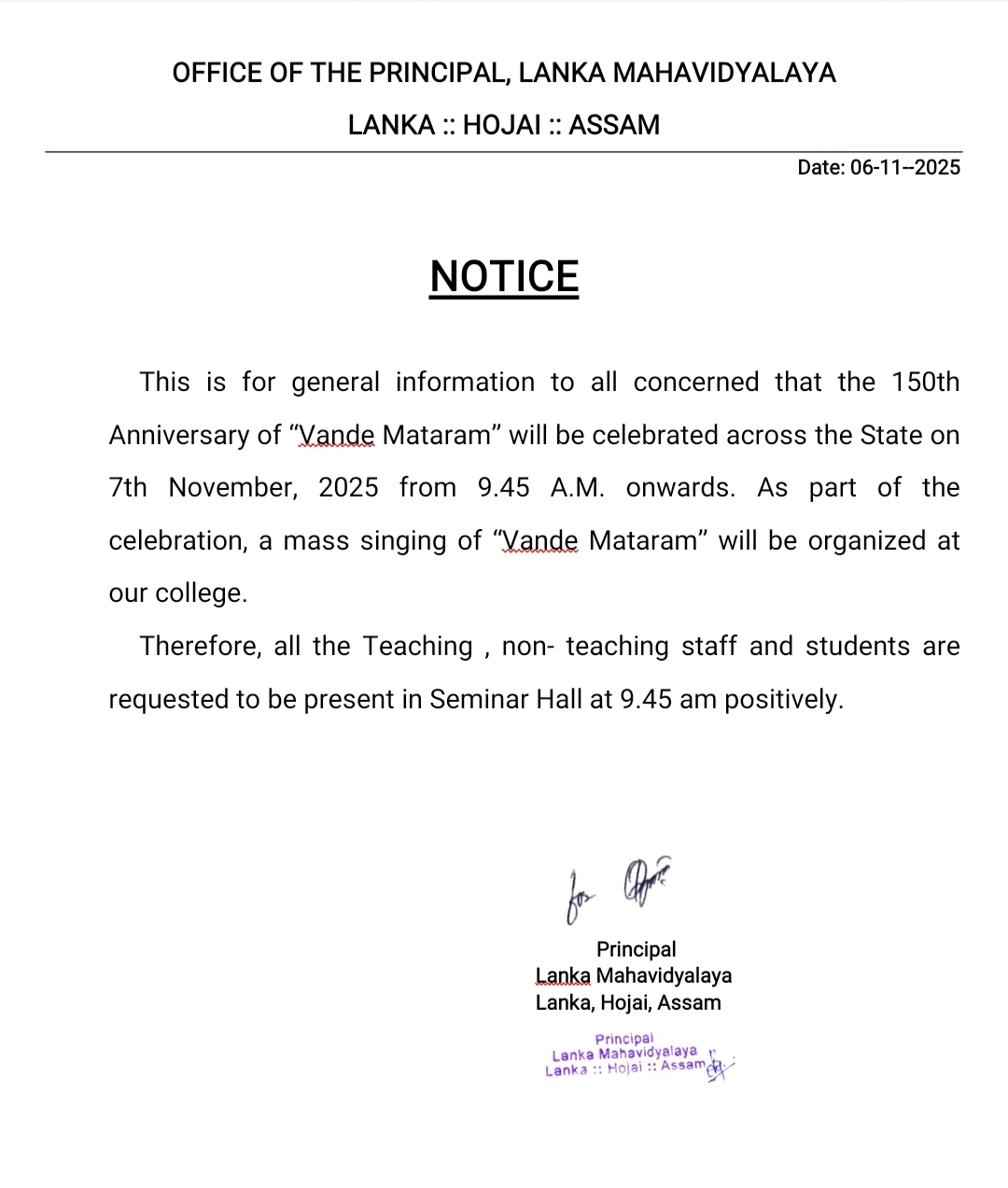 লংকা মহাবিদ্যালয়ৰ প্ৰতিষ্ঠা দিৱসত গীত মুকুলি