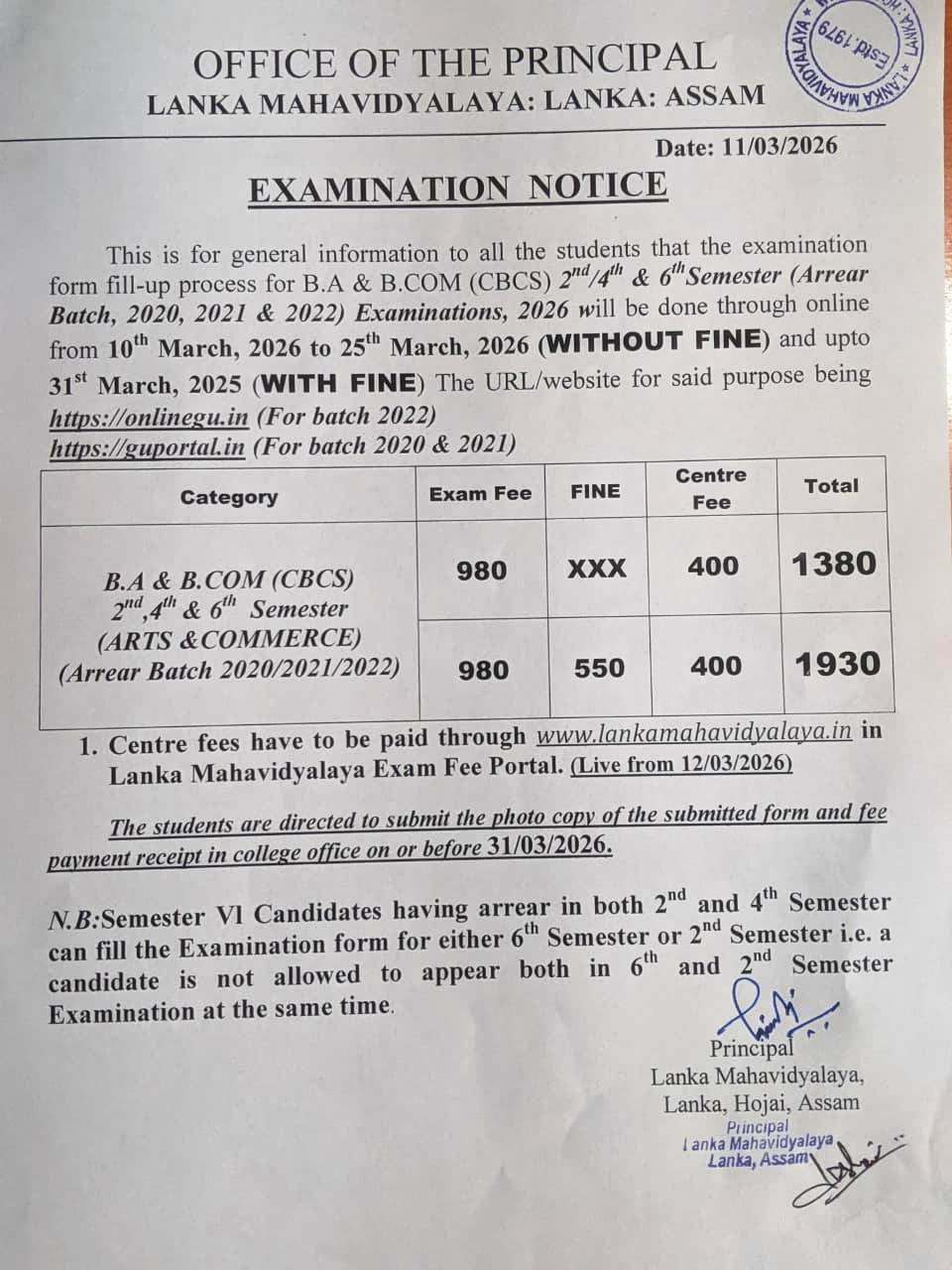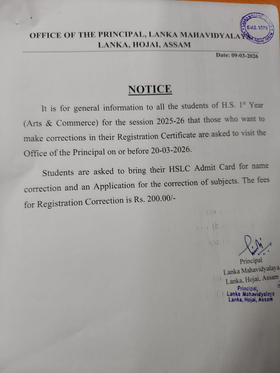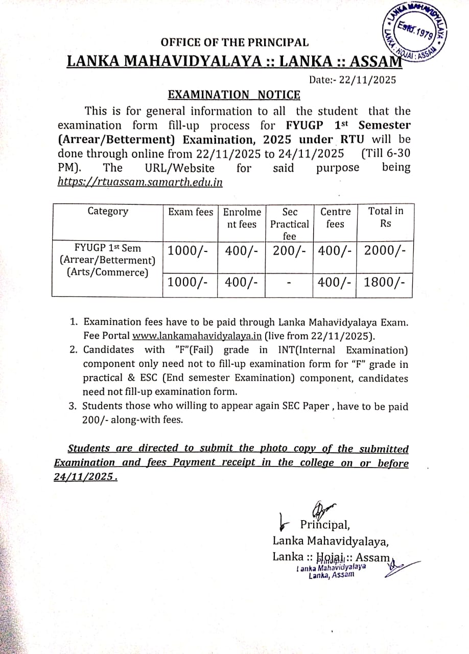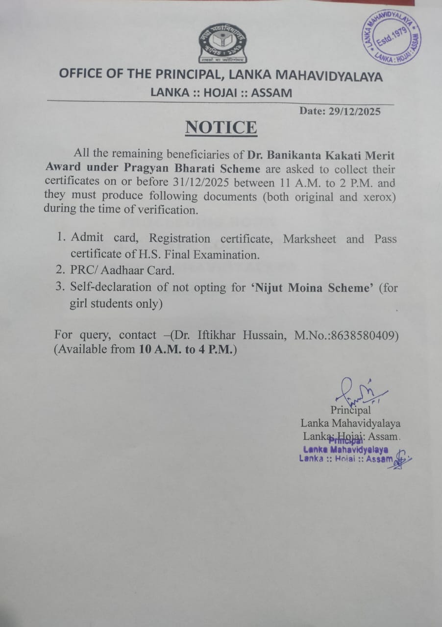 Lanka Mahavidyalaya was established on the 20th july,1979 in the northern outskirts of Lanka town which is situated in the southernmost part of the district of Hojai,Assam.Lanka is situated at a distance of about 180 kms from Guwahati,the capital city of Assam and about 10 kms. from Hojai,the district headquarter town .The site where the college stands todayspreads over an area of about 7 Acres amid green surroundings.